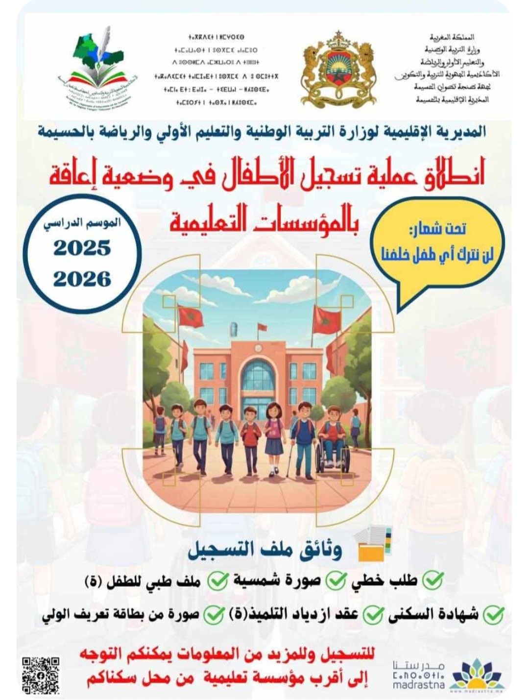 في إطار الجهود الوطنية الرامية إلى تعزيز التربية الدامجة وضمان الحق في التعليم للجميع، أعلنت المديرية الإقليمية لوزارة التربية الوطنية والتعليم الأولي والرياضة بالحسيمة عن انطلاق عملية تسجيل الأطفال في وضعية إعاقة بالمؤسسات التعليمية برسم الموسم الدراسي 2025-2026، تحت شعار: “لن نترك أي طفل خلفنا”.