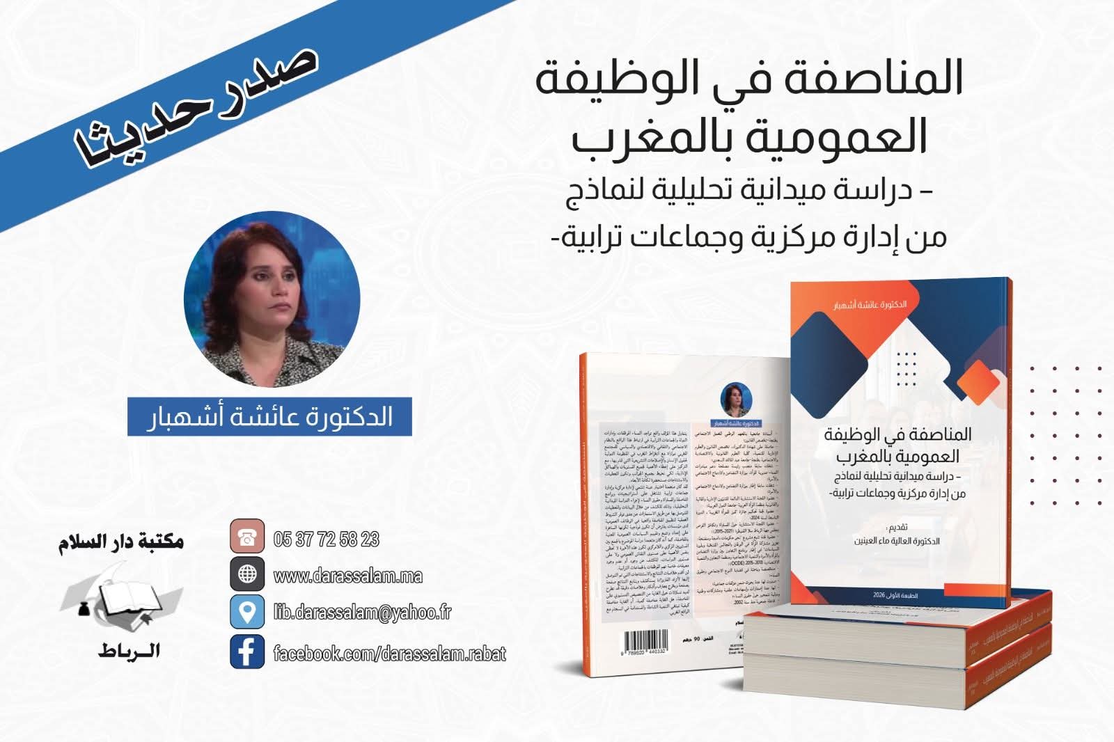 صدر عن مكتبة دار السلام للطباعة والنشر والتوزيع بالرباط، كتاب جديد للباحثة الريفية سليلة ايث حذيفة بإقليم الحسيمة الدكتورة عائشة اشهبار بعنوان : “المناصفة في الوظيفة العمومية بالمغرب- دراسة ميدانية تحليلية لنماذج من إدارة مركزية وجماعات ترابية”، وهو ثمرة جهد أكاديمي وبحث ميداني وممارسة مهنية.