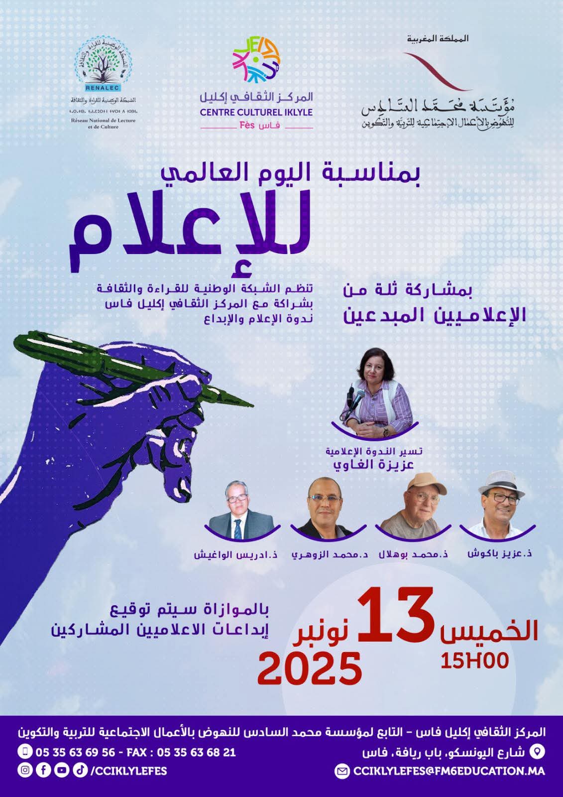 في إطار الاحتفاء باليوم العالمي للإعلام، تحتضن مدينة فاس يوم الخميس 13 نونبر 2025، ابتداء من الساعة الثالثة بعد الزوال، ندوة فكرية حول “الإعلام والإبداع” ينظمها المركز الثقافي إيكليل بشراكة مع الشبكة الوطنية للقراءة والثقافة.